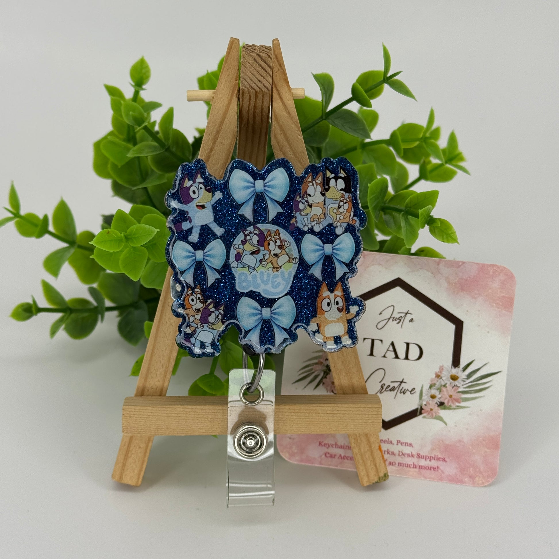 This interchangeable badge reel topper features an adorable blue dog and friends design with sweet bow details β perfect for anyone who loves a fun, cartoon-inspired touch.