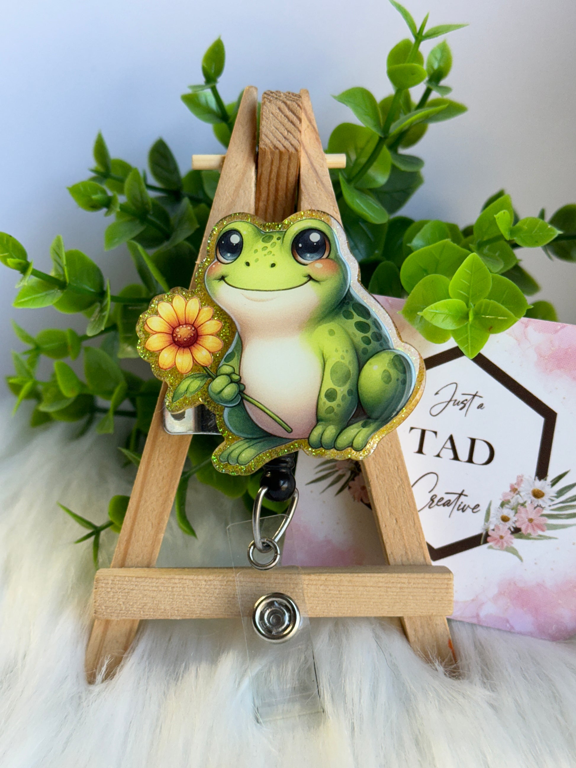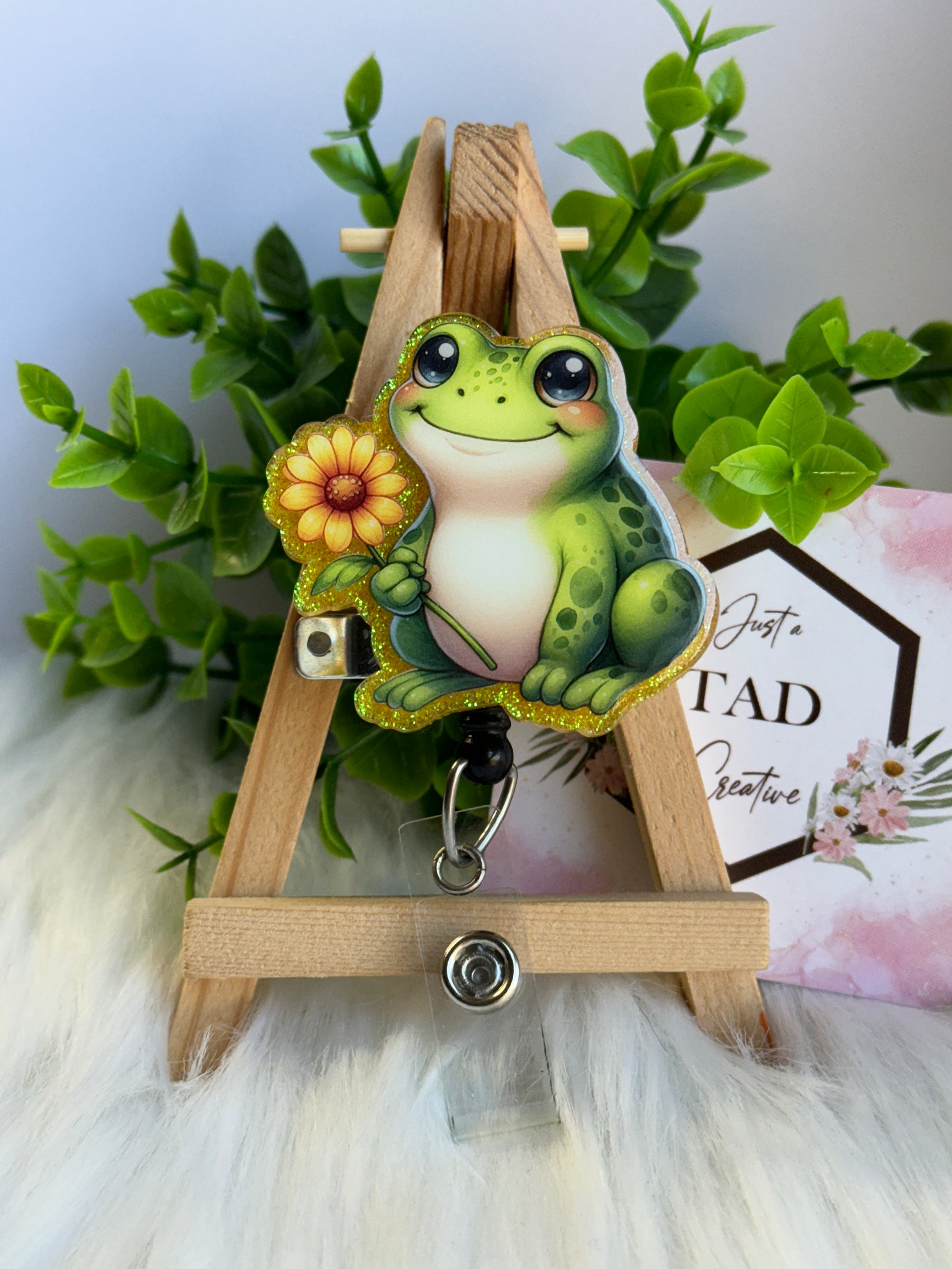 Hop on board with this interchangeable badge topper featuring a cute frog and flower design. Glitter accents give it a touch of fun. Simply attach to your badge reel for a playful touch to your work attire. Perfect for the frog-lover in your life!