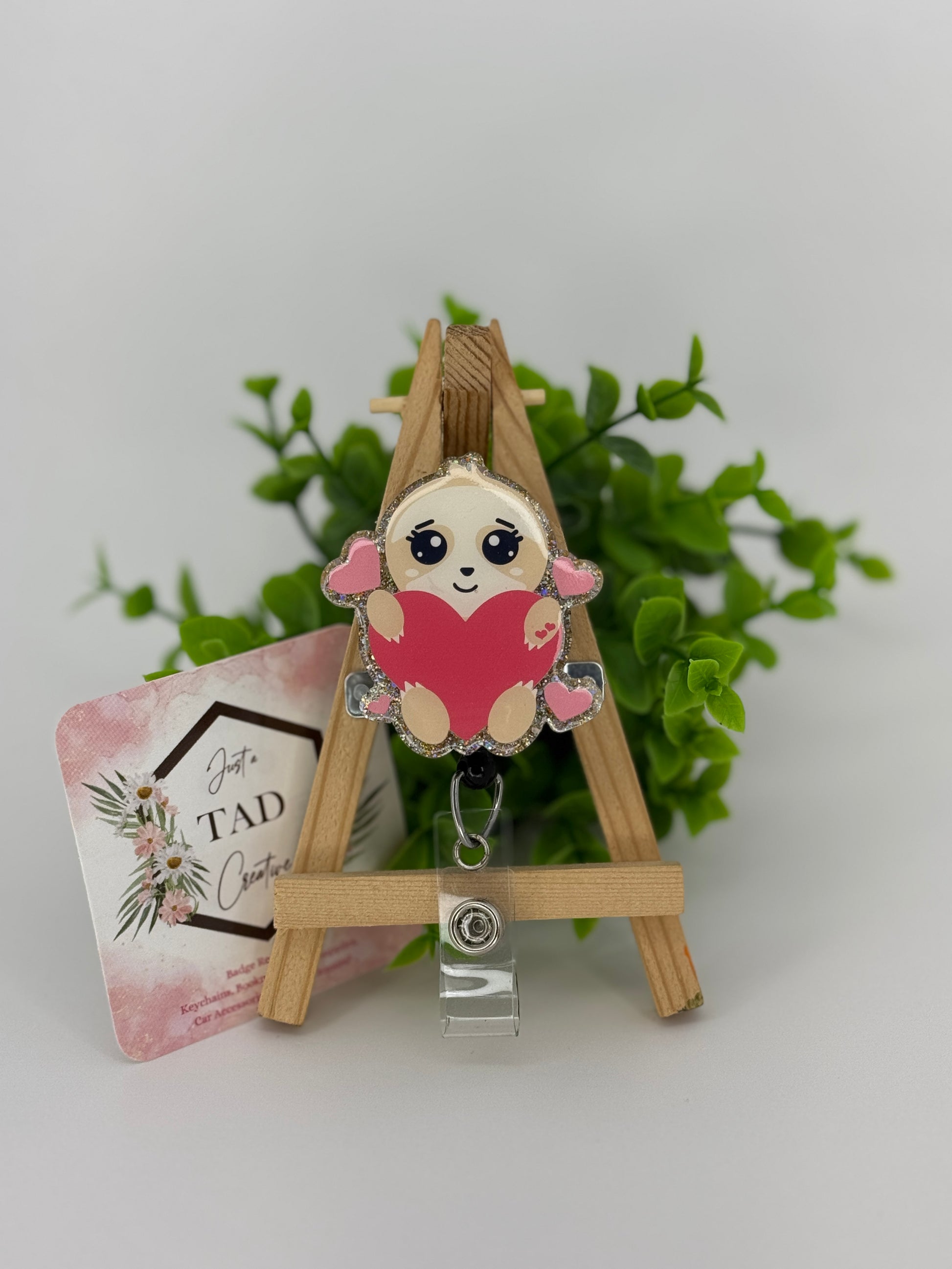 Spread love with this Cute Sloth Holding Heart Glittered Interchangeable Badge Reel Topper. Express your love and affection with the adorable sloth design and easily switch it up with the interchangeable badge topper feature. Perfect for adding a touch of cuteness to your daily work routine.