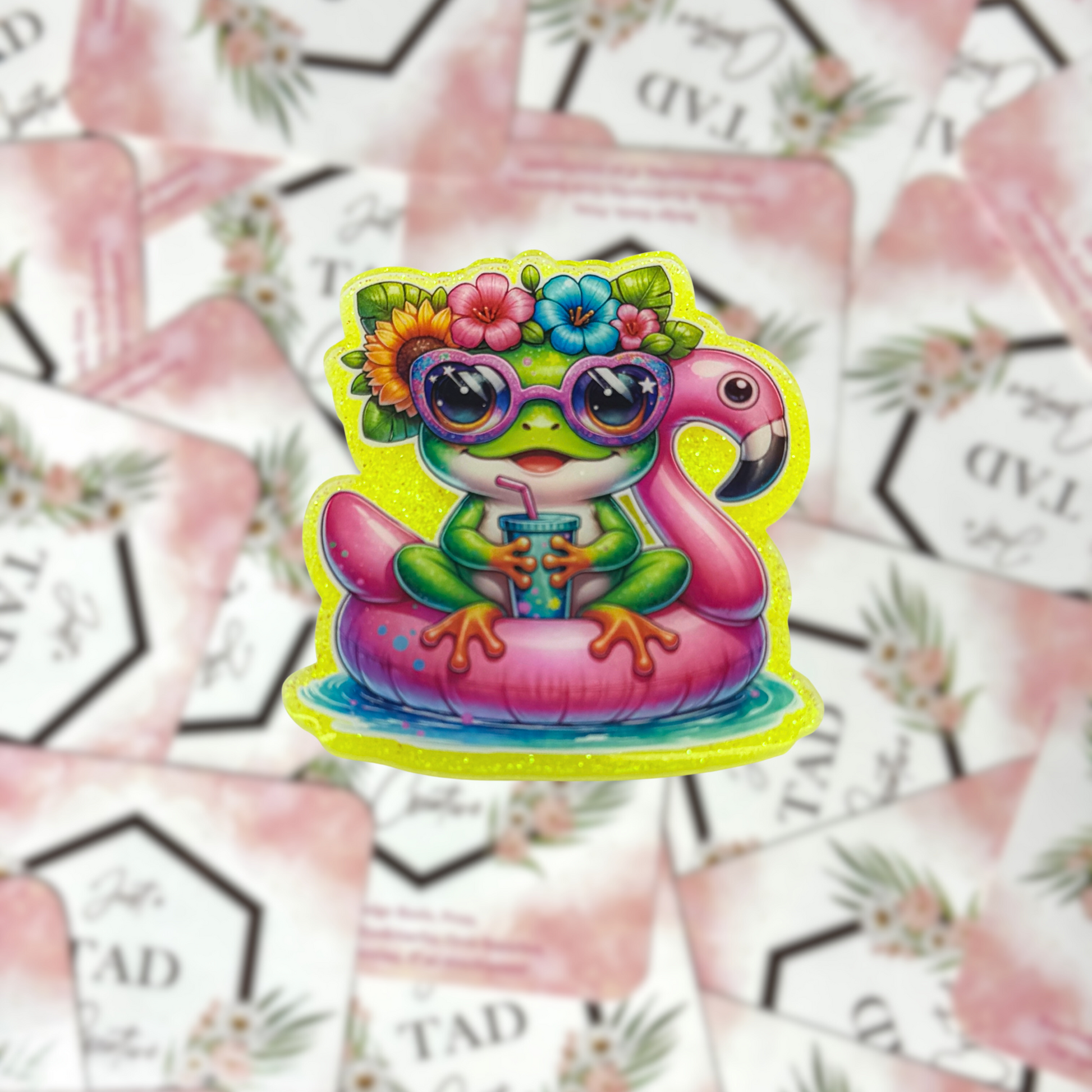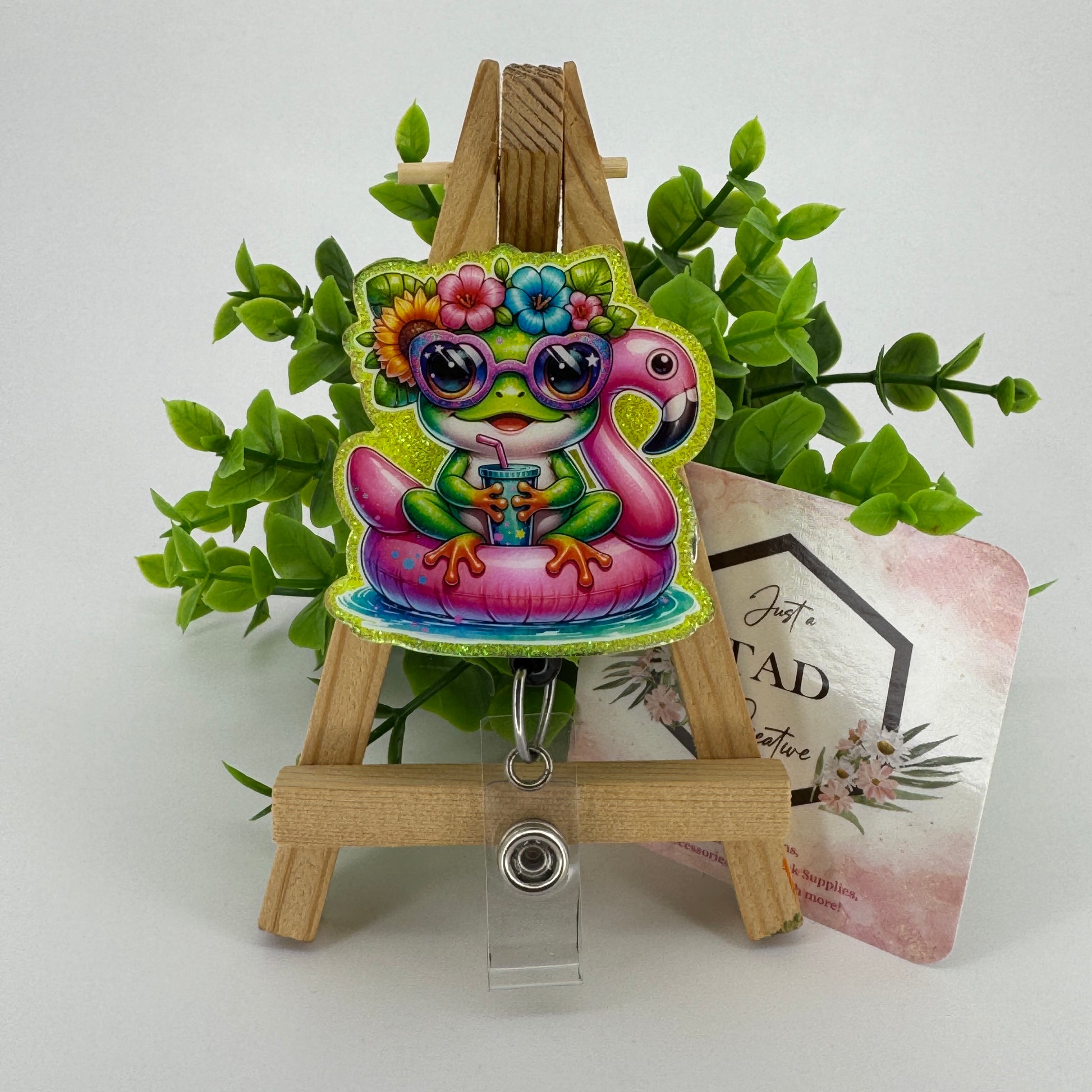 Brighten your badge reel with the Frog in a Pool Float interchangeable badge topper. Featuring a cheerful frog relaxing in a colorful pool float, this playful design adds a touch of summer fun to your everyday style. Easy to switch out, it’s perfect for bringing a lighthearted vibe wherever you go.