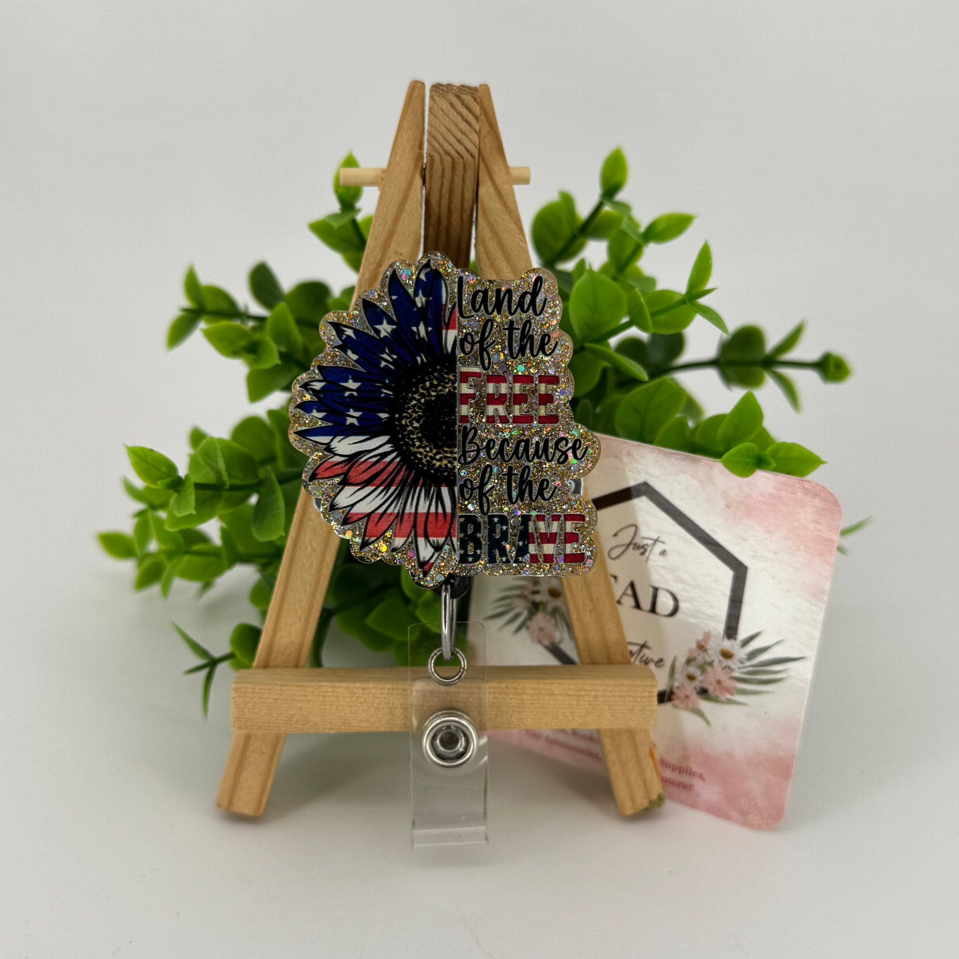 Celebrate bravery and freedom with the Land of the Free Because of the Brave Interchangeable Badge Topper. Featuring a bright sunflower adorned with the American flag, this cheerful badge reel topper is an easy way to show your patriotic pride with a sunny, uplifting touch.
