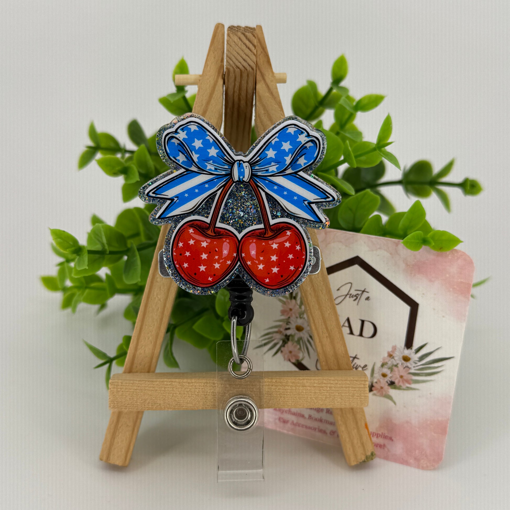 Add a splash of fun and patriotism to your workday with this interchangeable badge reel featuring cheerful cherries adorned with a large, festive bow. Perfect for showing off your spirited style while keeping your ID handy, this playful accessory combines practicality with a touch of whimsy. Brighten up any outfit and celebrate your love for the stars and stripes in a sweet, lighthearted way.