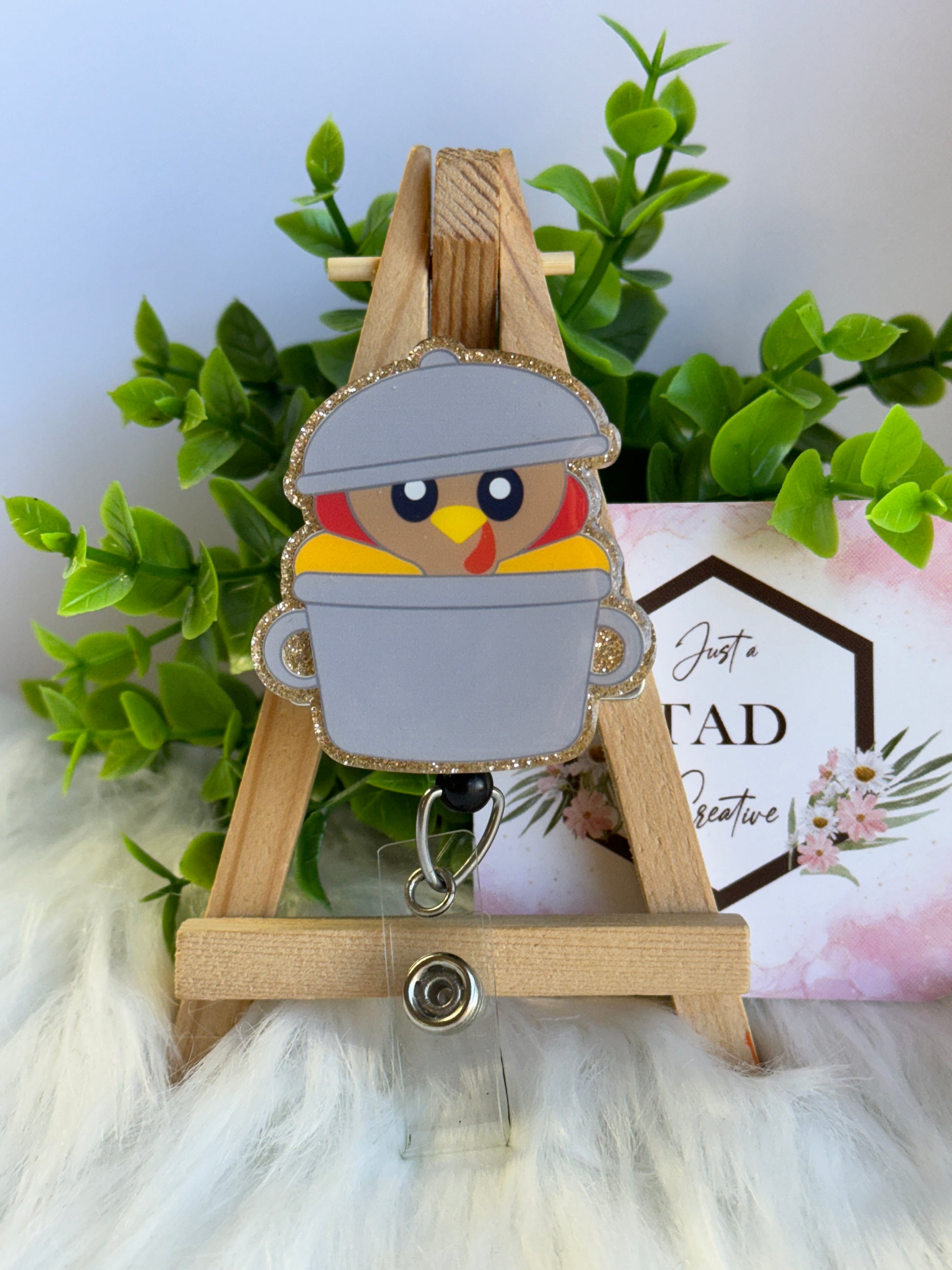 Elevate your office accessories with our badge reel interchangeable topper featuring a turkey in a stock pot design. Perfect for any turkey-lover, effortlessly switch out your topper to elevate your workday style. Expertly crafted with a professional touch, add a touch of personality to your work essentials.