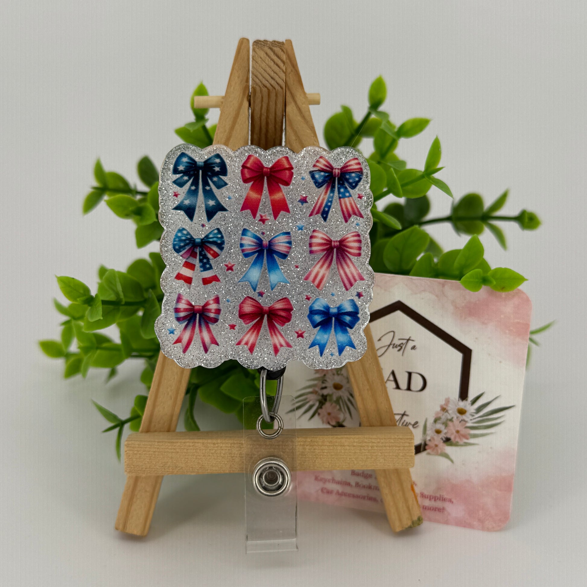 Add a playful touch to your badges with the USA Flag Coquette Bows Design Interchangeable Badge Topper. Featuring charming bows decorated in the classic stars and stripes, this topper easily swaps on to bring a fun and festive patriotic vibe to any outfit or accessory.